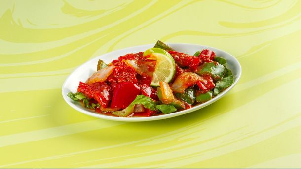 8 - 9 Τεμάχια. Κοτόπουλο πικάντικο σωτέ με σάλτσα chili, κρεμμύδι & πιπεριές πολύχρωμες